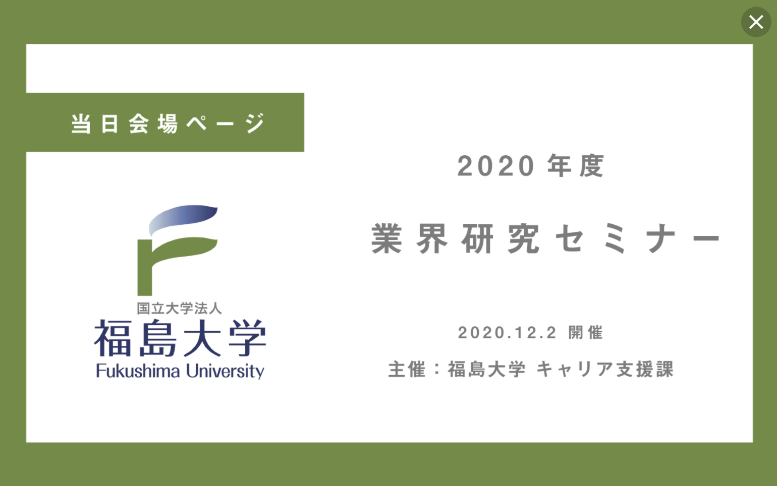 2020年12月2日(水)にオンラインキャリぷら(Remo)を活用して福島大学「2020年度 業界研究セミナー」を開催いたしました。