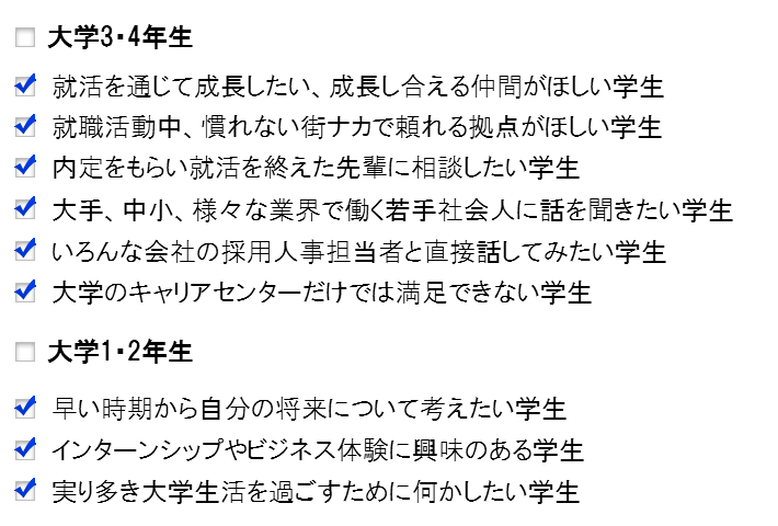 就職活動中の学生はもとより、これから活動することになる1年生や2年生、内定済みの4年生、就職して働いている若手社員、キャリアや就活を支援するキャリアコンサルタントや講師、大学の職員、企業の採用人事、各業界の第一線ではたらく社会人が集い語らう場所。