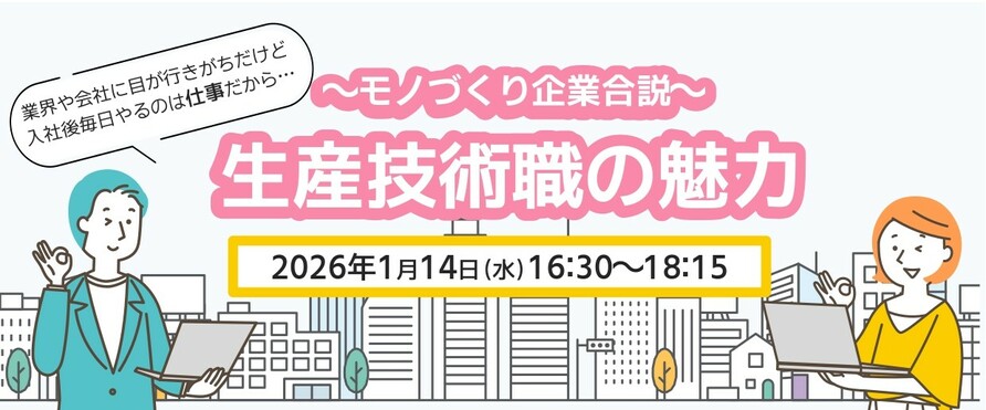 概要:北陸先端科学技術大学院大学主催、北陸エリア4大学合同で開催するミニ合説です。 「生産技術職」に焦点をあて、理系学生にその魅力を知らせるものです。 生産技術系職種の効果的な母集団形成にお役立ていただけます。 | 日程:2026年1月14日(水) 時間:16:30〜18:15 内容:企業PRタイム1分+座談会1ターム25分×3回 社数:5~6社程度 形式:オンライン(Zoom) 属性:北陸先端科学技術大学院大学、公立小松大学、富山県立大学、福島県立大学 27卒の学生 人数:20~50名程度 |