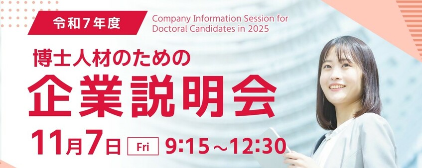 参加大学:九州大学、九州工業大学、国際教養大学 上記国公立大学との連携により、博士人材を対象とした合同企業説明会を開催いたします。参加企業による企業説明だけでなく、参加学生による研究発表の回も設けております。 | 日程:2026年1月16日(金) 時間:第1部11:00〜13:45、第2部14:00~16:45 内容:合同企業説明会 社数:各回20社程度 形式:オンライン(Zoom) |
