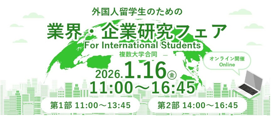| 日程:2024年11月1日(金) 時間:9:30〜12:20 内容:合同企業説明会 社数:20社 形式:オンライン(Zoom) |