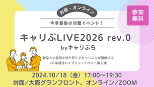 概要:1DAY就活まるごと体験学習プログラムを全国の26卒学生対象に開催します。 | 日程:2025年2月12日(水) 時間:10:05〜14:55 内容:ミニ説明会・模擬グループディスカッション・模擬面接・フィードバック 社数:3~5社 形式:オンライン(Zoom) 属性:26卒学生 人数:20〜50名程度 |