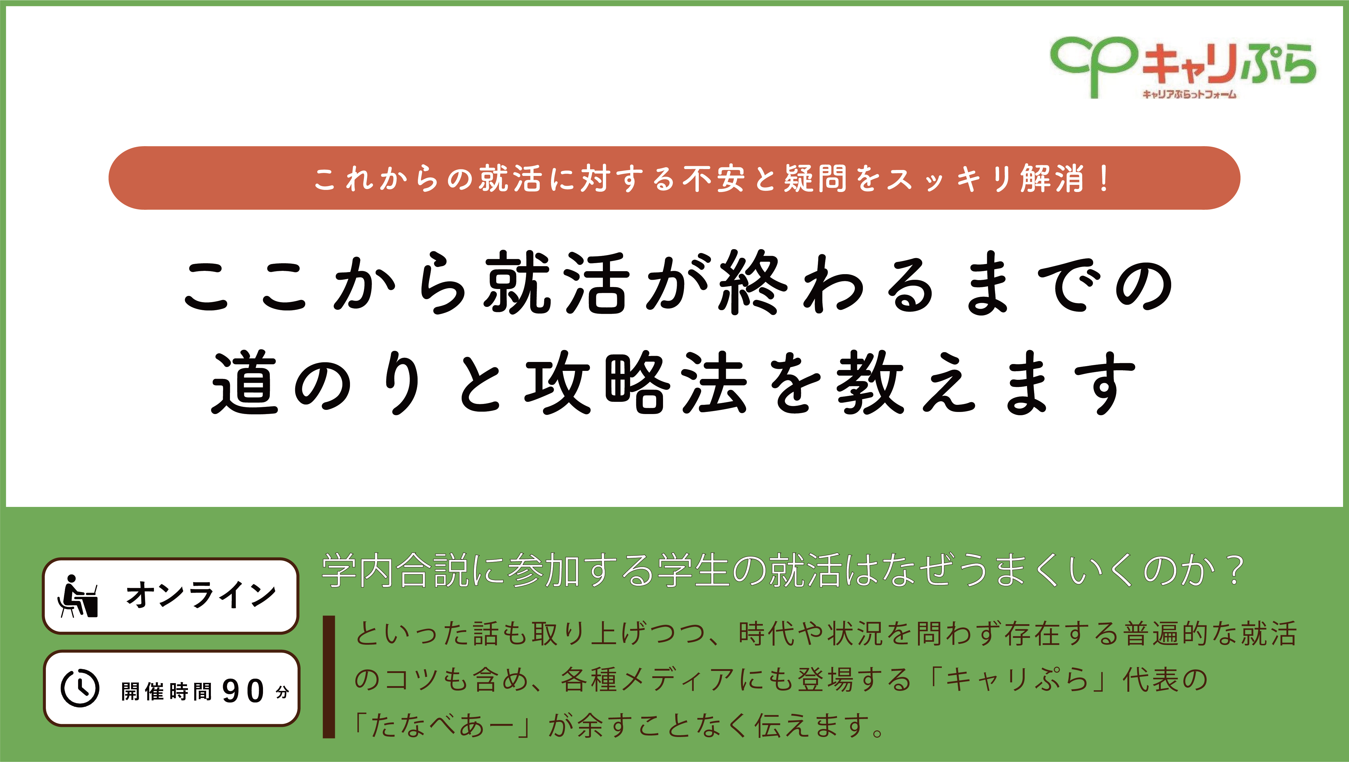 「ここから就活が終わるまでの道のりと攻略法」をテーマに、就活に対する不安を解消し、参加者皆さんの疑問に応えるイベントを開催します。