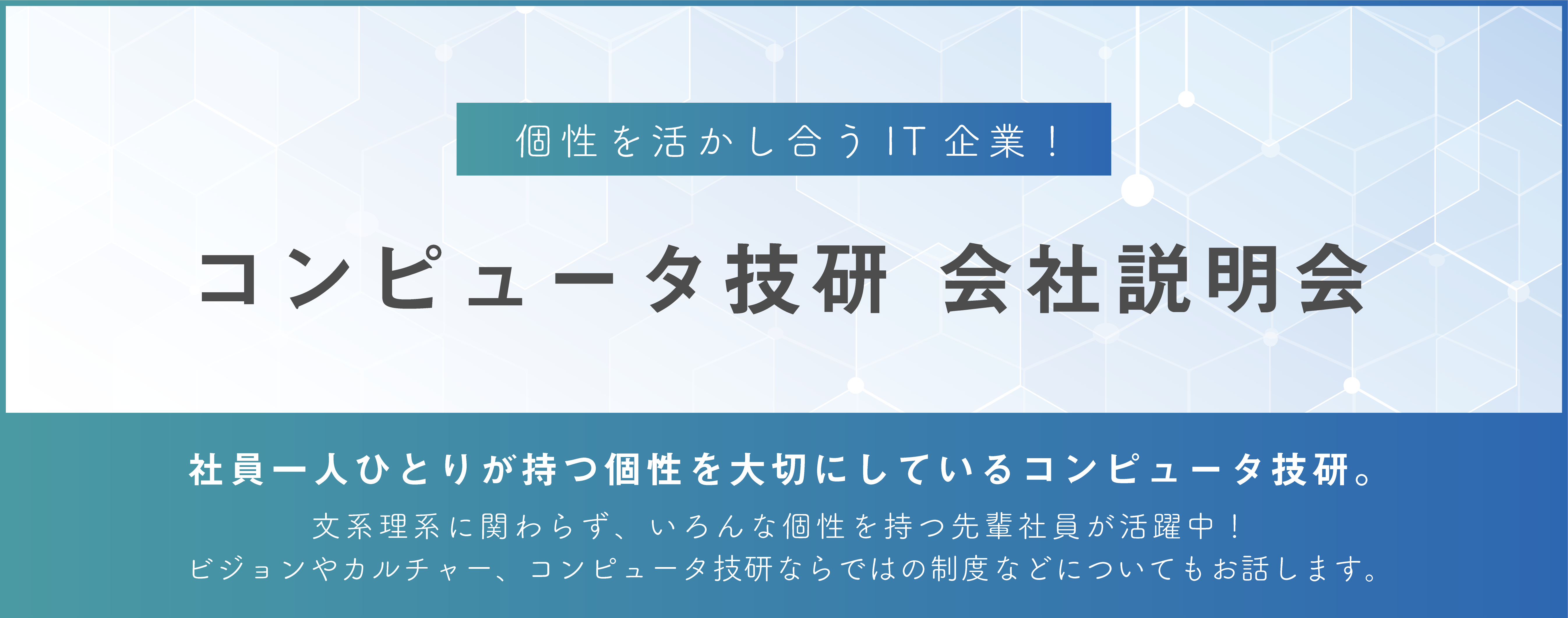 会社説明会では事業内容はもちろん、ビジョンやカルチャー、コンピュータ技研ならではの制度などについてもお話します。