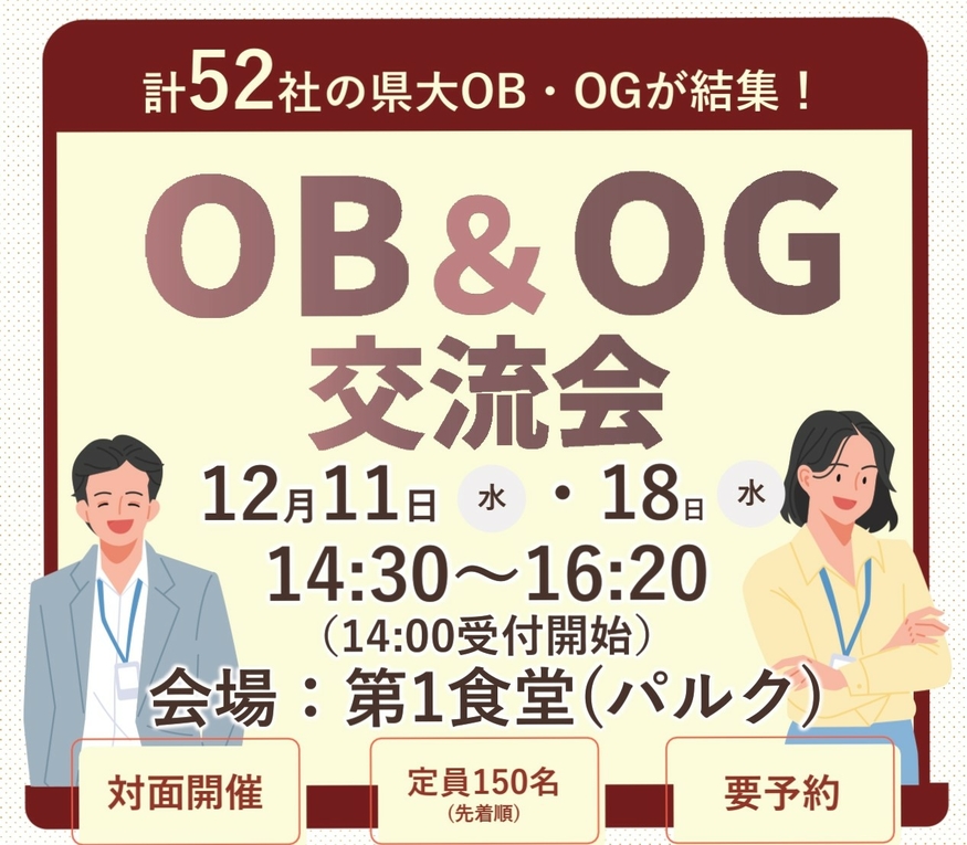 開催日時・ タイムスケジュール | 2024年12月11日(水)14:30~16:20(受付14:00~14:20) 2024年12月18日(水)14:30~16:20(受付14:00~14:20) ※18日(水)参加希望の場合は、キャリア支援室に連絡をお願いします。 14:00~14:20 受付<第1食堂(パルク)前> 14:30~15:10 諸説明・1分企業PRタイム 15:10~15:30 ターム1 15:35~15:55 ターム2 16:00~16:20 ターム3 |