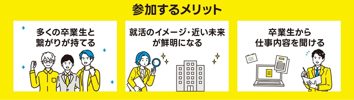 確認事項 | ・1ターム25分で各社のOB・OGと座談会形式で交流をします。 ・ターム1と2については、事前に皆様からの希望の業界を確認し、着席ブースを指定します。 ※人数の関係により、希望通りにならない場合もあります。ご了承ください。 ・ターム3と4は自由に企業のテーブルへ訪問してください。 ・原則途中入退室はできません。 ・申込後、キャンセルする場合は必ず連絡先の運営事務局(日本キャリアセンター)までメールまたは電話でご連絡ください。 |