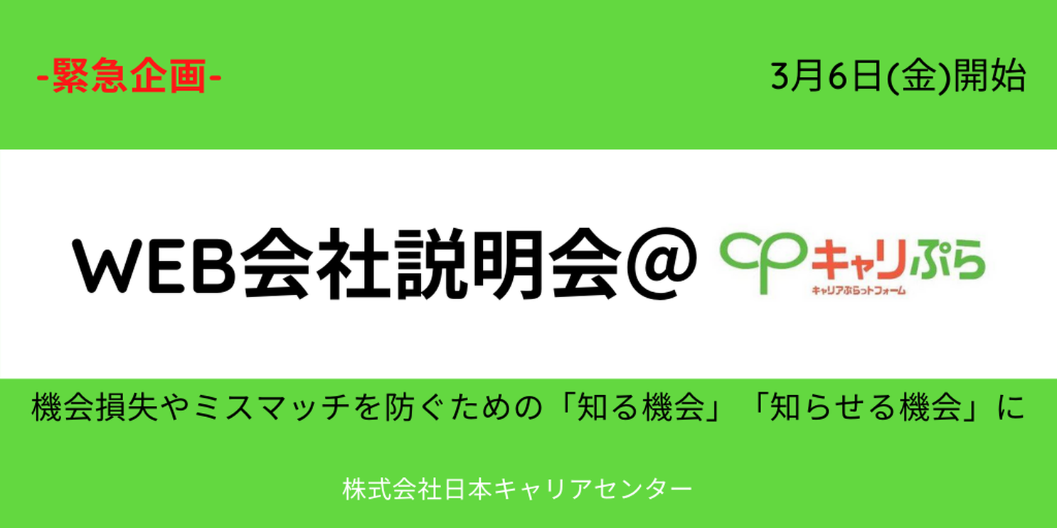 就職情報会社による合同企業説明会にはじまり、各大学が開催する学内合同企業説明会に至るまで、大規模な採用イベントが中止になっています。また、個社の会社説明会もその多くが中止や延期が決まる中、学生と企業の双方にとってお互いに「知らせ」「知る」場が失われています。