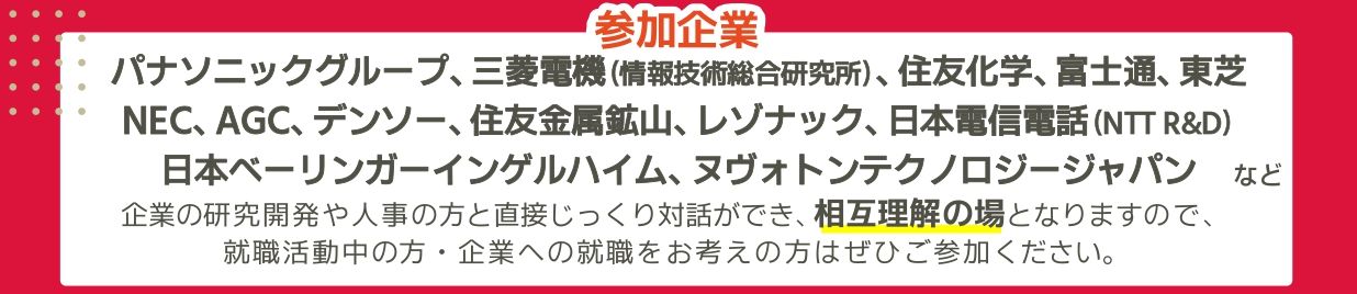 博士人材の採用を希望する有力企業が多数参加します。※以下に参加企業一覧へのリンクあり