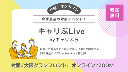 概要:1DAY就活まるごと体験学習プログラム。 | 日程:2025年2月12日(水) 時間:9:30〜15:30 内容:IS説明・パネルトーク・座談会 社数:3~5社 形式:オンライン |