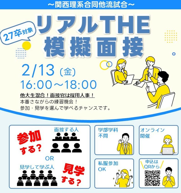 16:00~16:05 チェックイン 16:05~16:25 企業紹介(各社5分程度) 16:25~16:30 休憩・移動 16:30~17:10 模擬面接 17:10~17:30 フィードバック 17:30~17:35 面接ミニセミナー 17:35~17:40 休憩・移動 17:40~18:00 質疑応答・お知らせ |